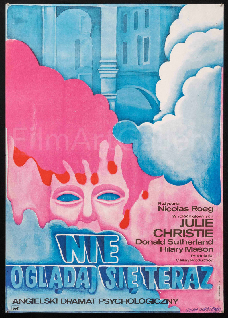 First Polish release poster - with Maria "Mucha" Ihnatowicz artwork - for classic 1973 Nicolas Roeg thriller, set in Venice and starring Julie Christie & Donald Sutherland