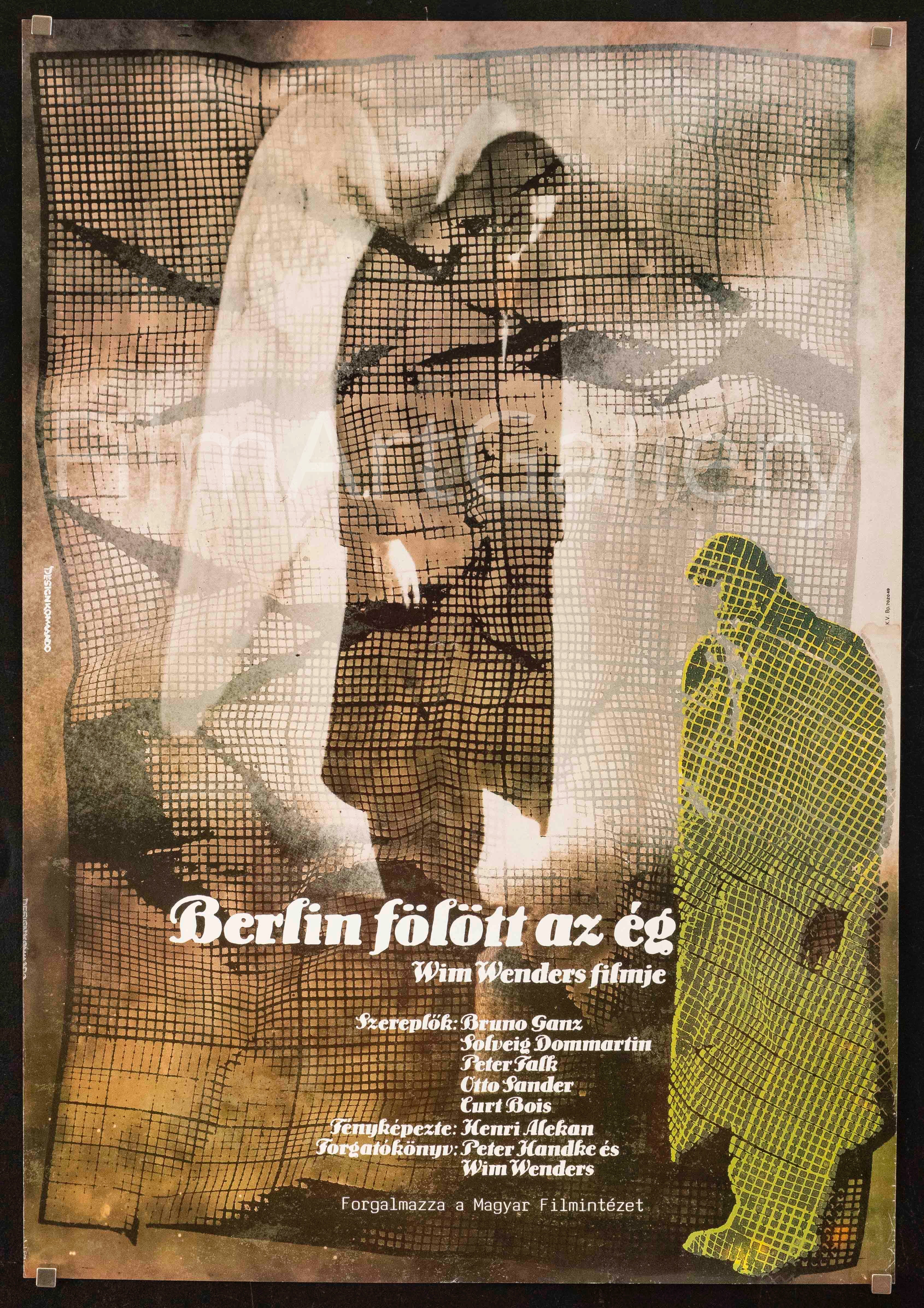 First Hungarian release poster for acclaimed Wim Wenders film starring Bruno Ganz and Peter Falk; aka "Der Himmel uber Berlin". The poster artwork is by Komasado